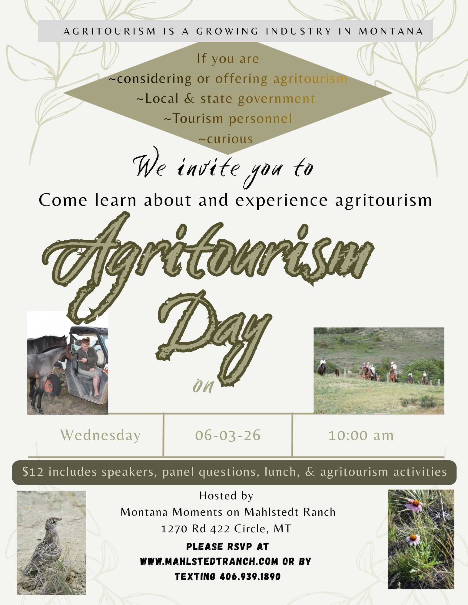 Are you curious about opportunities in agritourism? Please register and join this informative event hosted by Montana Moments on the Mahlstedt Ranch.